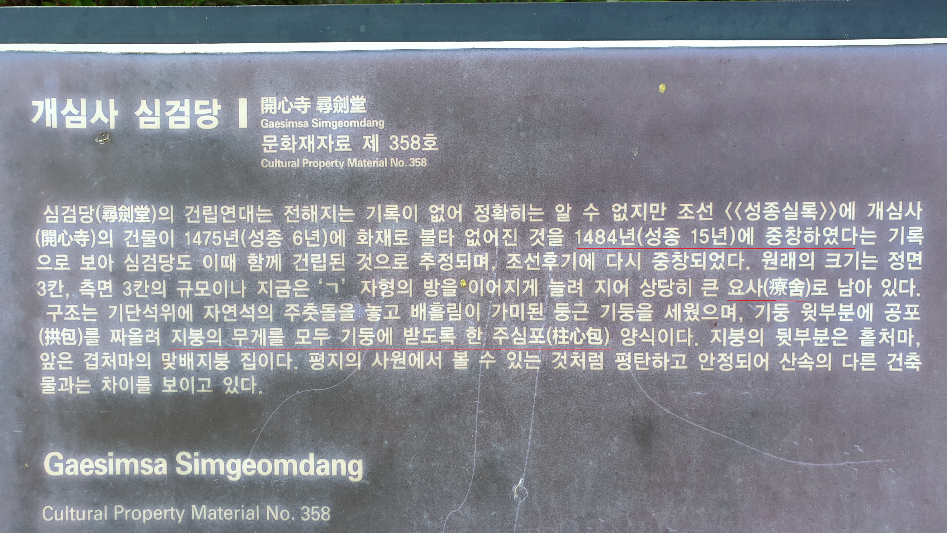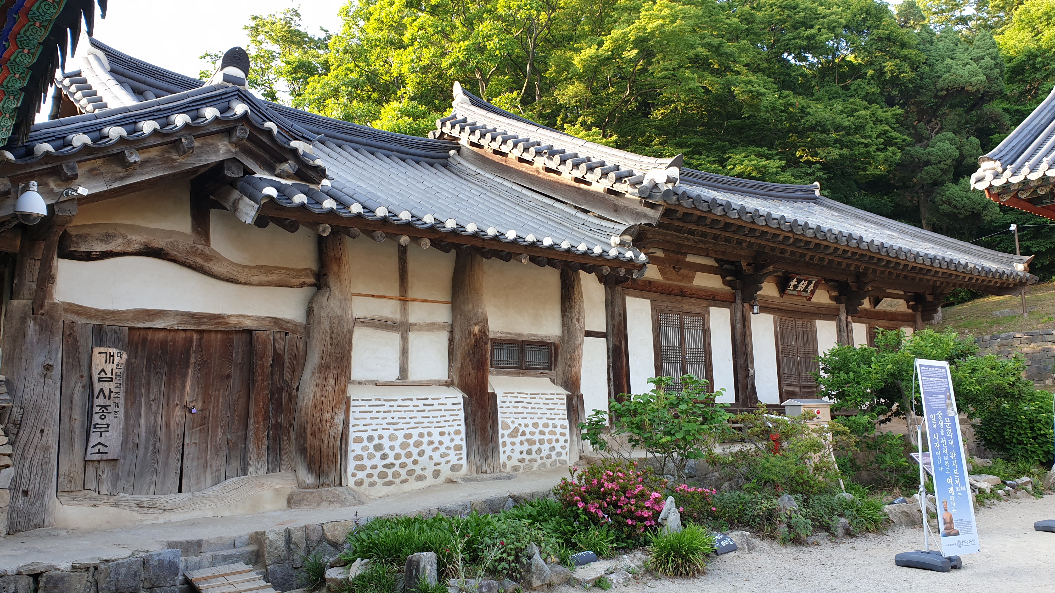 심검당 왼쪽에 있는 종무소 기둥과 보를 보면, 보는 타원형으로 구부러진 정도가 아니라 지렁이 기어가듯 한 모습이며, 기둥의 위와 아래 굵기가 다른 것은 물론 심지어는 두 개의 나무를 이어서 쓴 것도 있으니 벌써 그 시절에 아나바다를 실천했다는 얘기다.